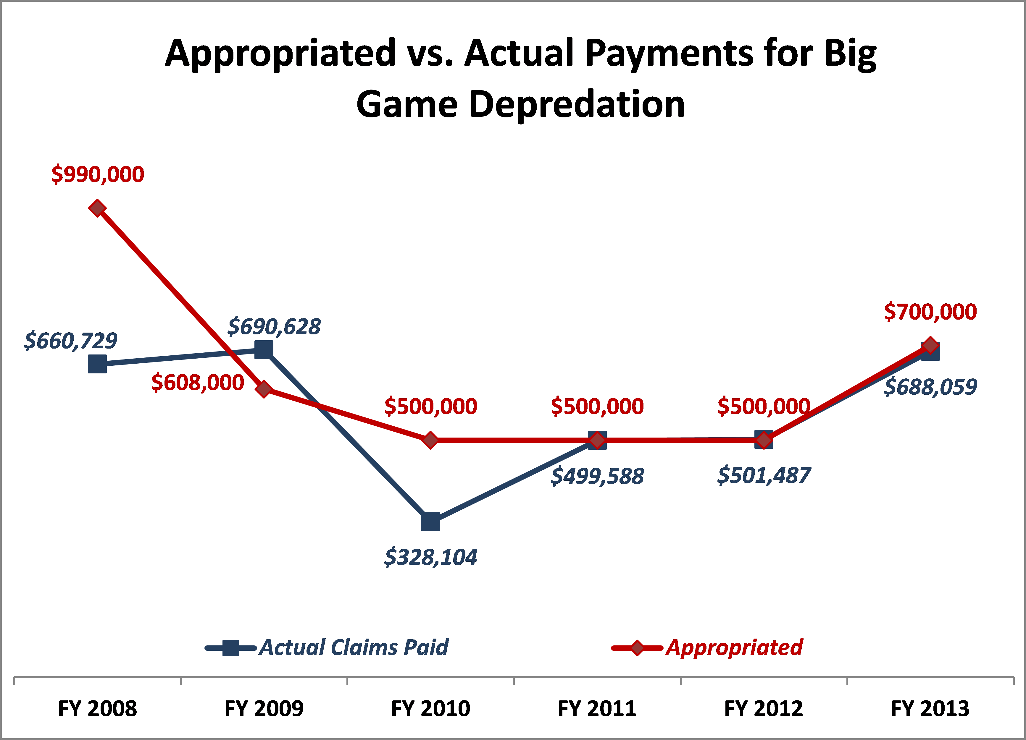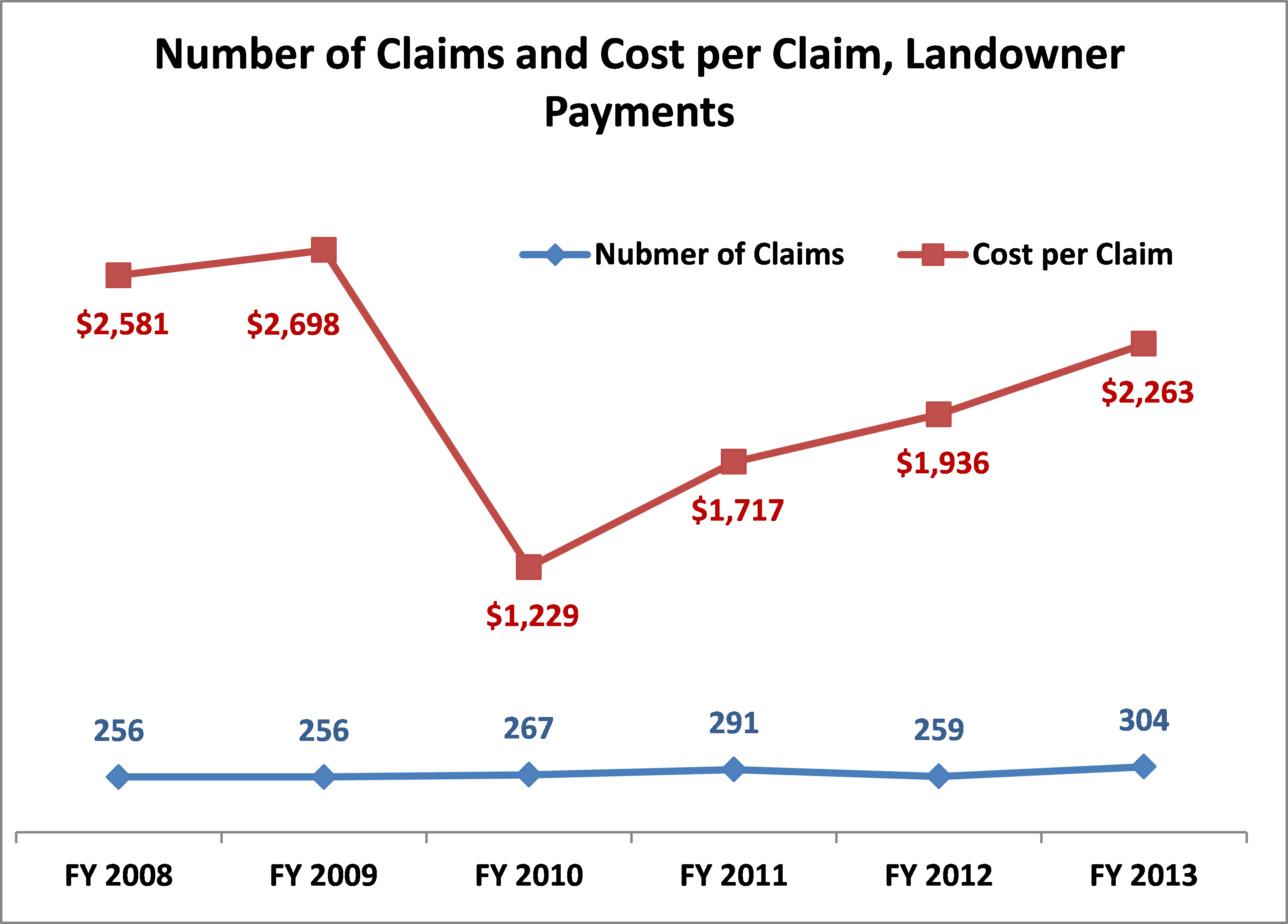 Ivan D. Djambov (![]() If big game animals are damaging cultivated crops, fences, or equipment on private land, the landowner or lessee can receive compensation. The Division of Wildlife Resources (DWR) is responsible to contact the landowner or lessee within 72 hours and assess the reported damage. UCA 23-16-4 specifies the responsibilities of DWR to compensate for the damages. The statute directs the following to be considered when determining damage payment: 1. The extent of the damage; and 2. The revenue the landowner derives from: a. participation in a cooperative wildlife management unit; b. use of landowner association permits; c. use of mitigation permits; and d. charging for hunter access. According to statue, DWR compensation for damages to cultivated crops is to include: 1. The full replacement value in the local market; and 2. The cost of delivery of a replacement crop. The number of landowner claims for big game depredation has been increasing since FY 2008 (see figure below). Among the reasons for this increase, according to DWR, are drought conditions, cold winters, fires, etc. The data also shows that the cost per claim is increasing as well. DWR staff stated that one of the main reasons for the cost increase is the fact that the cost for replacement of these types of commodities has been increasing. For example, hay has almost doubled in price. DWR receives an annual appropriation for such claims. Both the appropriated and actual amount for depredation payments were increased in FY 2013. DWR If these trends continue, DWR will need to budget more money for depredation payments, or re-assess and improve the effectiveness of its damage-prevention approach. |