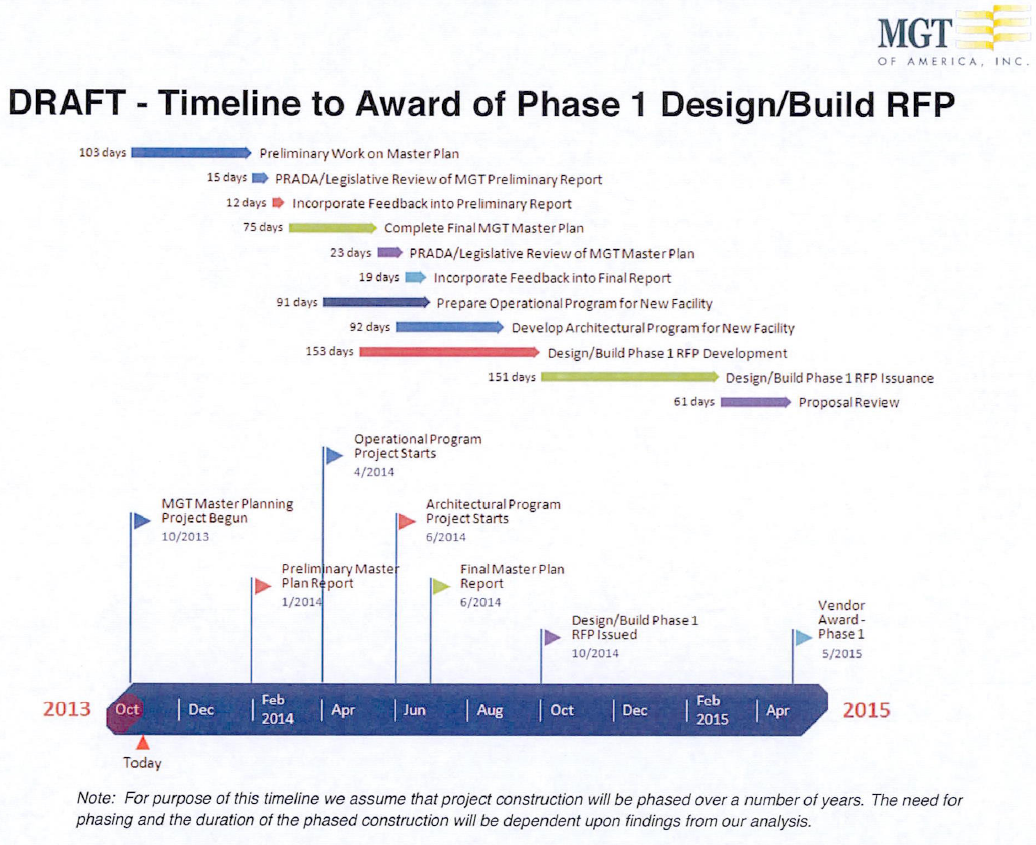 Steven M. Allred (![]() The Executive Appropriations Committee recently received an update on PRADA's activities. At the urging of the Governor's Office, PRADA has postponed the release of a Request for Proposal (RFP) until spring of 2014. During the 2013 General Session, the Legislature passed Senate Bill 72, "Prison Relocation and Development Amendments," which modified the Prison Relocation and Development Authority (PRADA). Among other things, the bill required PRADA to "issue a request for proposals inviting persons to submit proposals on a new prison development project, current prison land development project, or master development project." Based on the information gathered in the proposals, the authority should make a recommendation to the Governor and the Legislature. PRADA has met nine times and toured facilities in Utah and Arizona. The committee has hired an executive secretary, an appraiser to appraise the property in Draper, a cost estimator to determine the cost to bring current Draper buildings up to proper standards, and a programming consultant. The authority prepared an RFP requesting bids for a new prison facility and for developing the land in Draper. However, the Governor did not sign the RFP and asked for more time. PRADA has asked the programming consultant to continue to study the issues and come back with recommendations in the spring, at which time the committee hopes to issue the RFP. Lane Summerhays, who chairs the committee, anticipates the authority will make a final recommendation in time for the 2015 General Session. In the meantime, he expressed that there is an immediate need for more corrections beds. He hopes a master plan will be available to the Legislature by the 2014 General Session to help legislators decide whether to fund the beds at Gunnison or take an alternative course of action. The Legislature appropriated $430,000 ongoing and $680,000 one-time in FY 2014 to implement the bill. As of October 18, 2013, the authority had spent or obligated $595,800, leaving a balance of $514,200. The appropriation is nonlapsing. The following chart, prepared by the programming consultant, shows a draft timeline to issuance of an RFP for phase one of designing new facilities. |